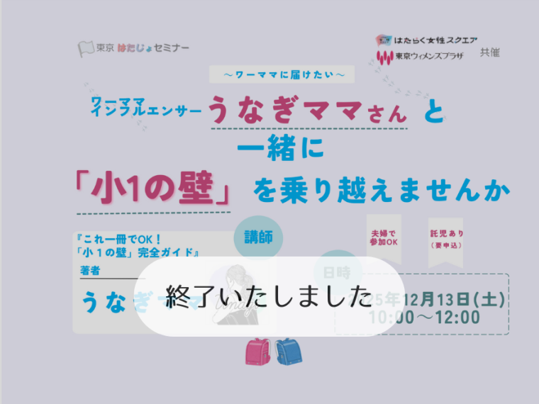 【終了いたしました】2025/12/13(土)東京はたじょセミナー ~ワーママに届けたい~ ワ―ママインフルエンサーうなぎママさんと一緒に「小1の壁」を乗り越えませんか